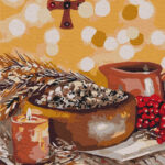 бполотно на лляній основі та дерев’яному підрамнику з нанесеною пронумерованою схемою майбутньої картини. Всі сегменти додатково пофарбовані в тон кольорів, якими буде зафарбовувати полотно